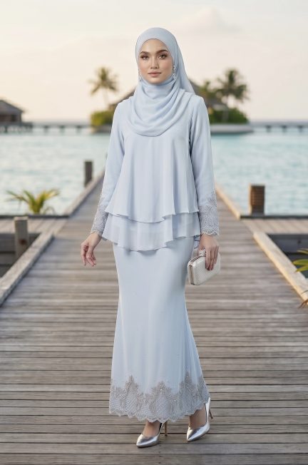 Untuk design ini kami menggunakan material Chiffon dihiasi dengan patch lace jahitan tangan dan taburan rhinestone